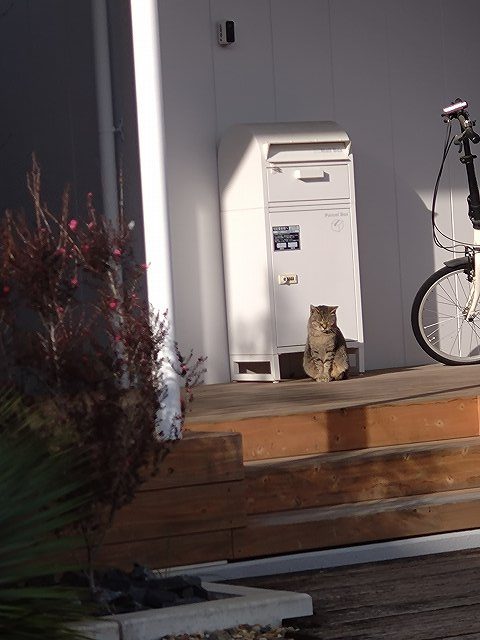 白いポストの前で佇んでいます。